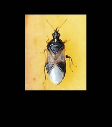 Nabis sp. Chinche esbelto, color bruno pajizo, cabeza y tórax asemejan una punta de lanza, ojos pronunciados, patas largas
